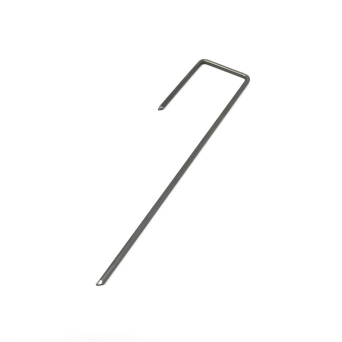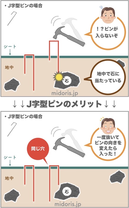 通常、U字型のものが多いのですが、ピン1本で2か所地面に刺すため、石などにあたってピンが曲がり打ち損じてしまうことが多いです。ミドリスオリジナルのJ字型は、片方が短くなっており、打ち損じを減らすことができます。