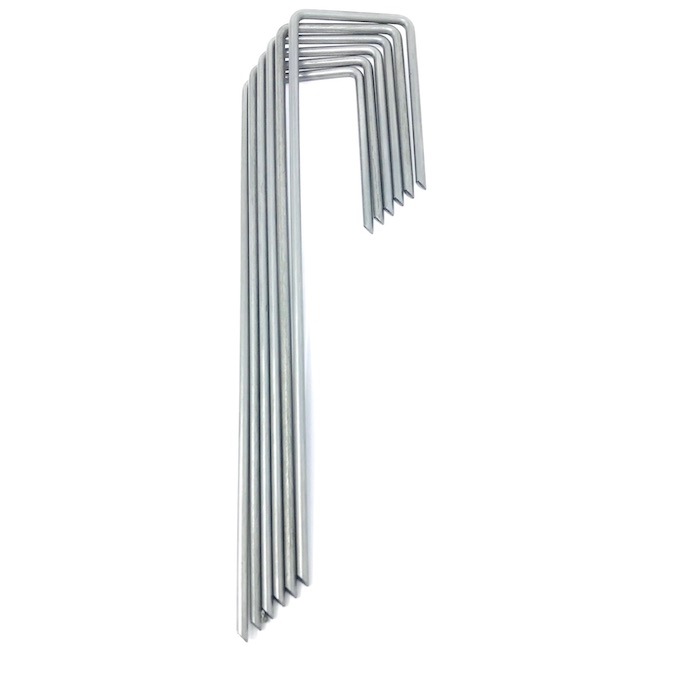 敷設する土地がでこぼこしている場合は1平米あたり8個を目安に打ち込んでください。鉄製なので、さびる事で摩擦が高くなりシートから抜けにくくなります。