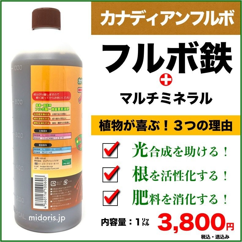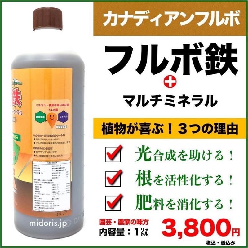 フルボ酸でキレートすることで、鉄をはじめとした各種ミネラル・微量要素の浸透性を飛躍的に高めた、フルボ酸複合液肥です。
