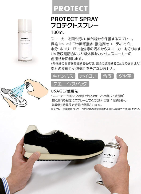 - スニーカーを雨や汚れ、紫外線から保護するスプレーです。繊維1本1本にフッ素系撥水・撥油剤をコーティングし水分、ホコリ、ゴミ、油分等の汚れから守ります。UV吸収剤配合により紫外線をカットしスニーカーの色褪せを抑制します。