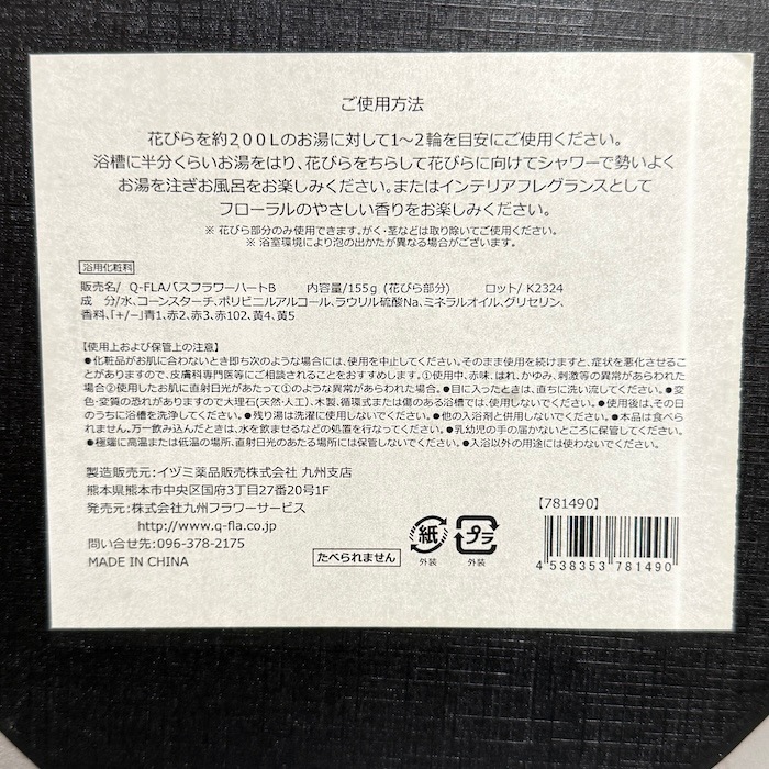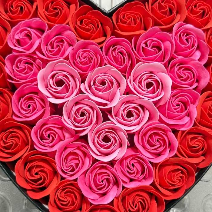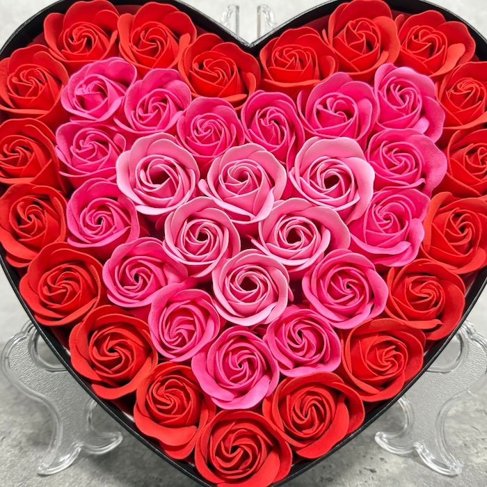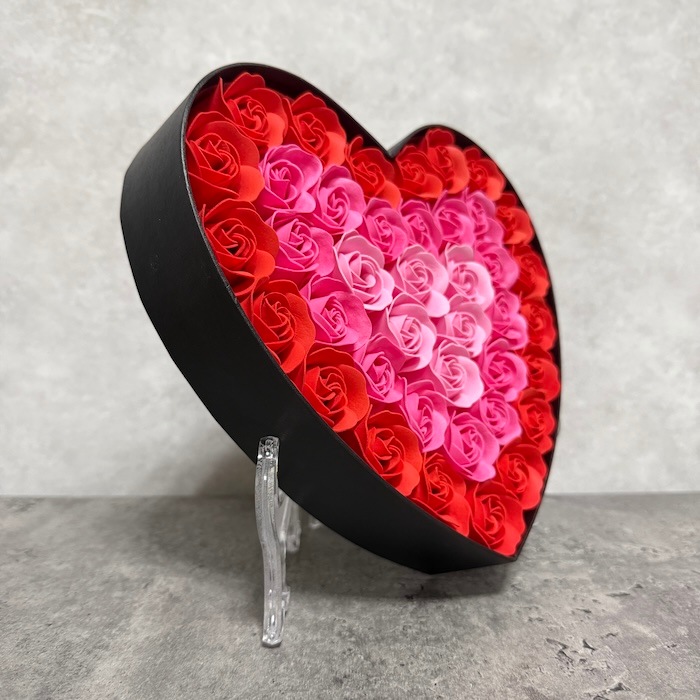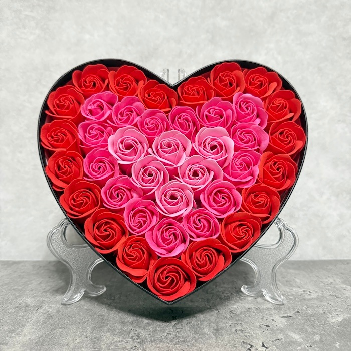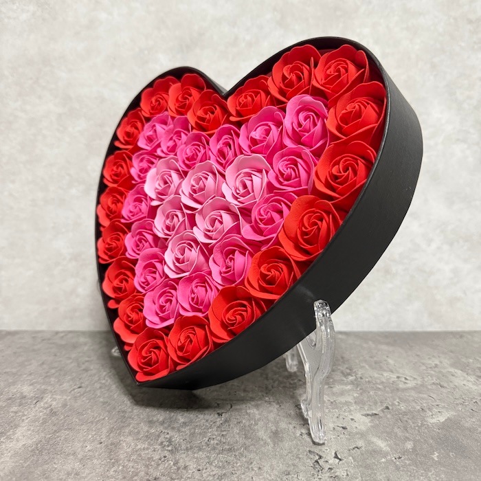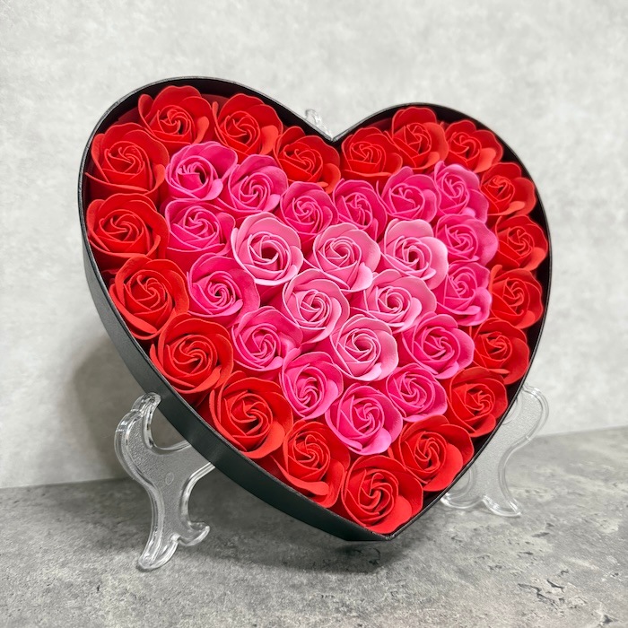 鮮やかな赤い花びらをハート型にアレンジした、華やかなバスフレグランスボックス。