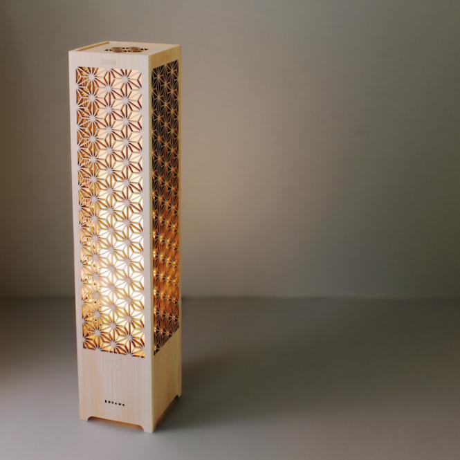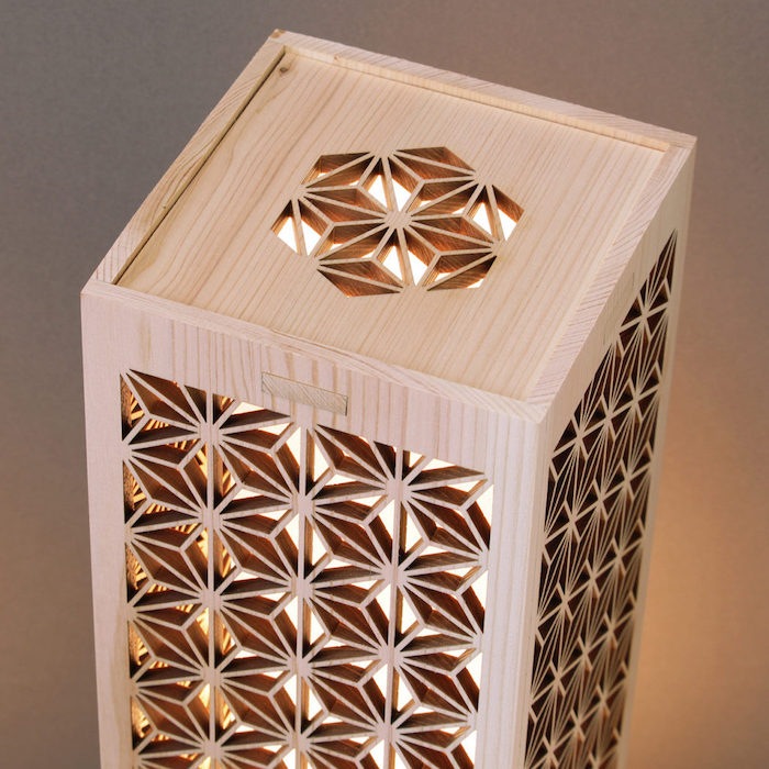 円筒形の照明部をヒノキの透かし彫りで囲み、内部空間が垣間見える立体構造になっています。