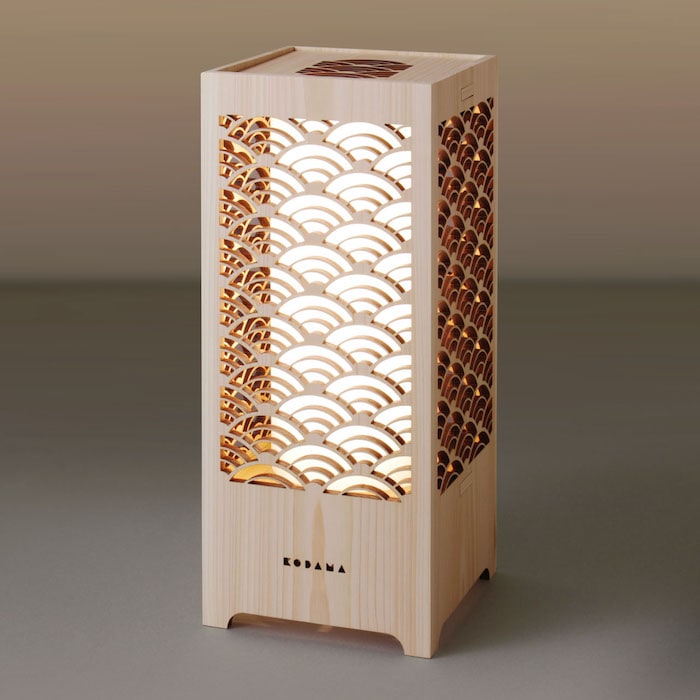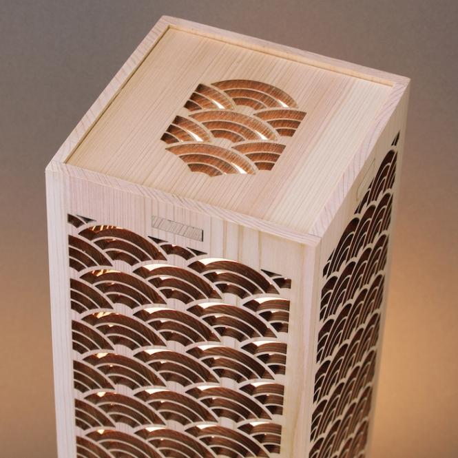 円筒形の照明部をヒノキの透かし彫りで囲み、内部空間が垣間見える立体構造になっています。