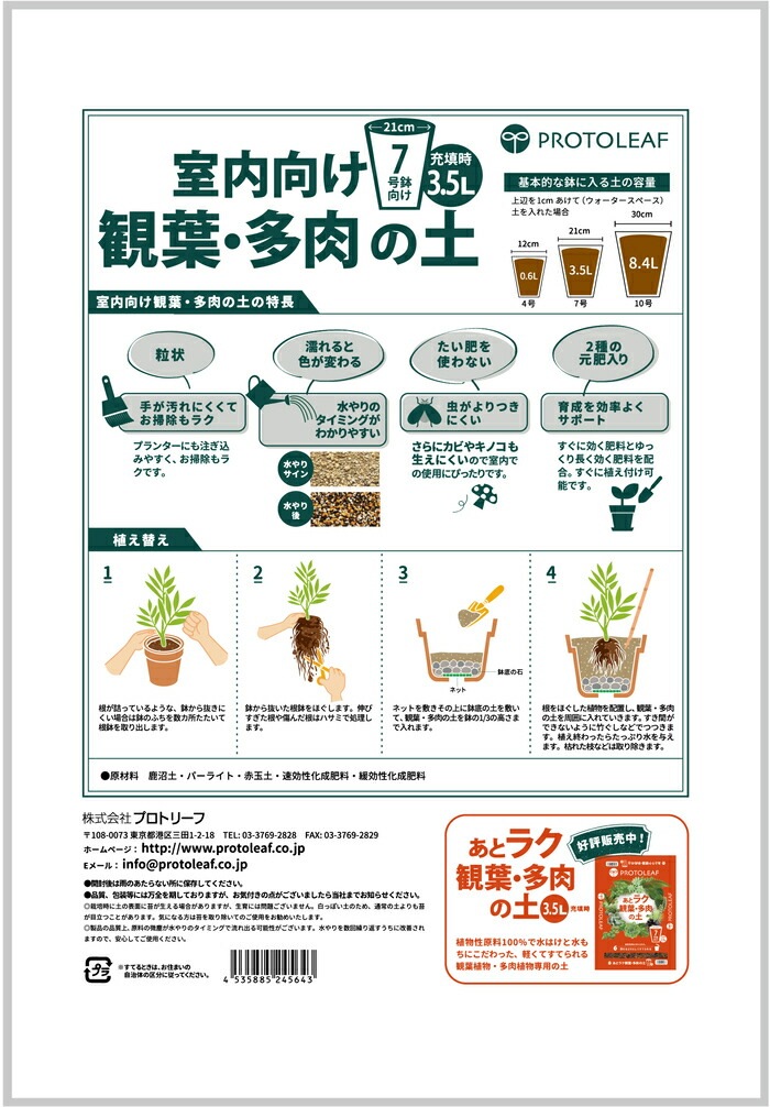 たい肥を使わずに粒状の原料だけで作り上げた、観葉植物と多肉植物専用の培養土です。