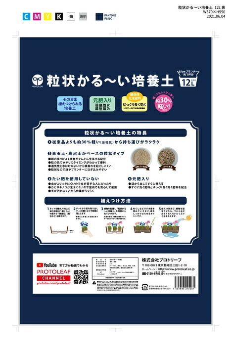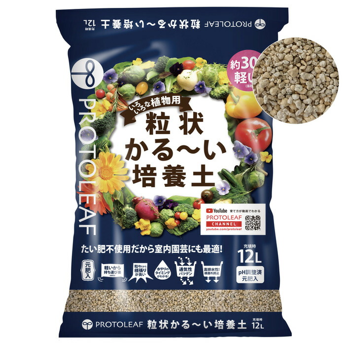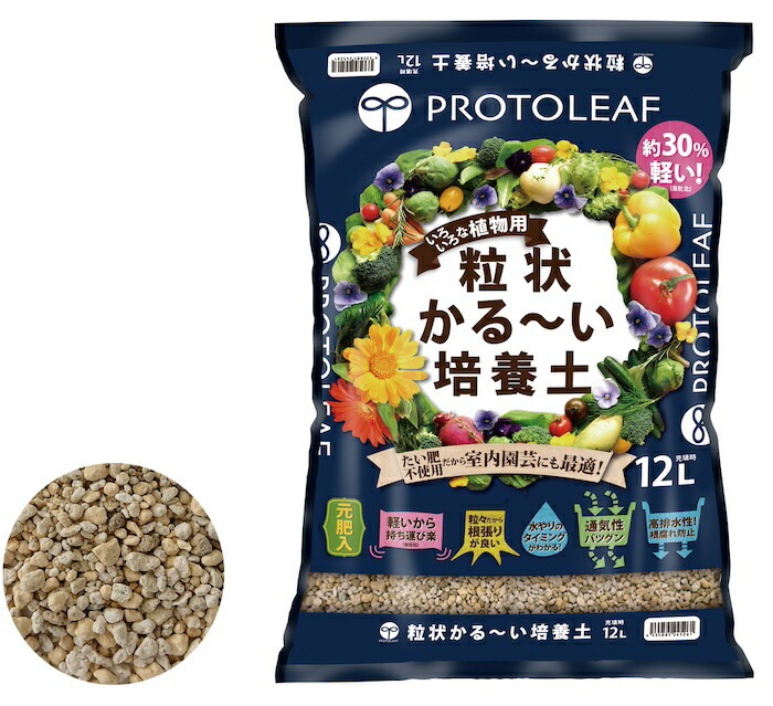 粒状の原料のみを使い、通気性と排水性にこだわり、従来品とくらべて約30%の軽量化を実現した(プロとリーフ社比)、持ち運びやすい培養土です。