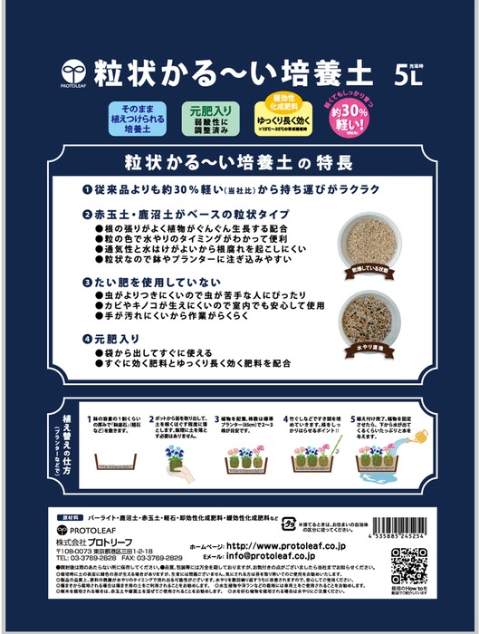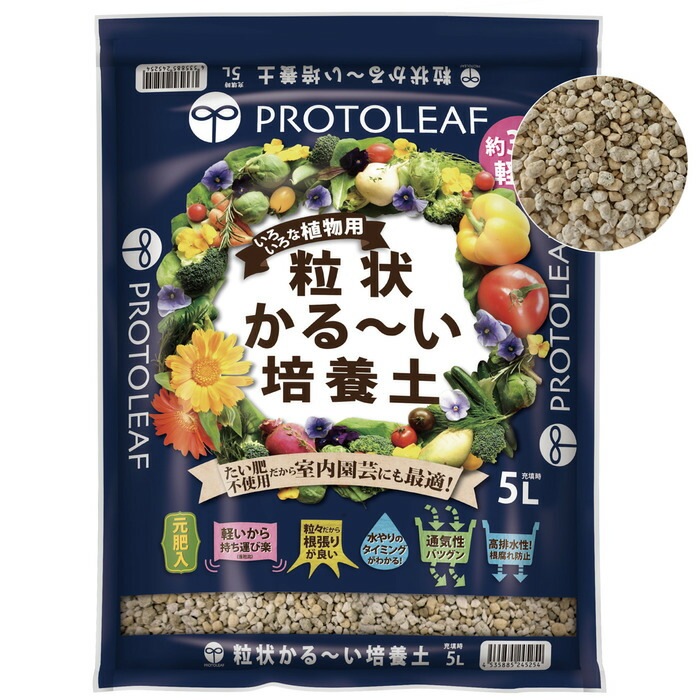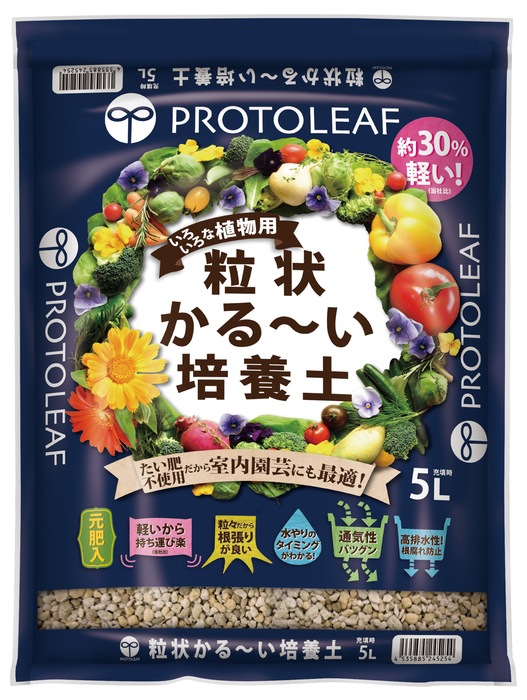 粒状の原料のみを使い、通気性と排水性にこだわり、従来品とくらべて約30%の軽量化を実現した(プロとリーフ社比)、持ち運びやすい培養土です。