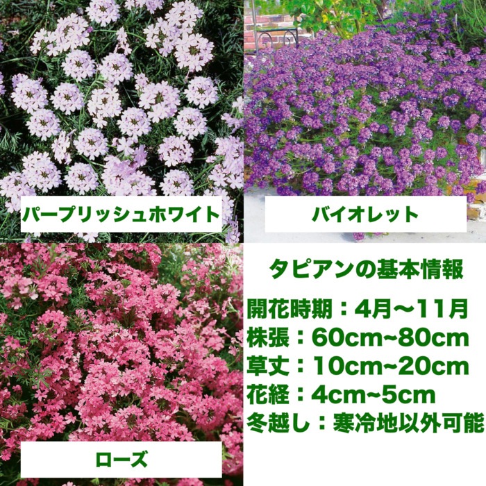 タピアン 3色×各1株 合計3株 9cmポット苗 肥料付き 3号 常緑多年草 バーベナ属 グランドカバー 品種 パープリッシュホワイト ローズ バイオレット サントリーフラワーズ 雑草対策 宿根草