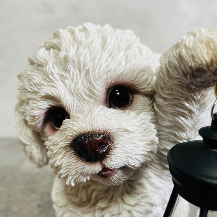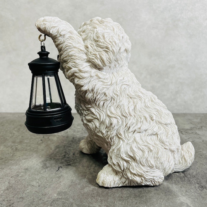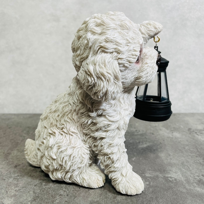 ソーラーランプを左手で持ち上げるトイプードルのオブジェ(置物)