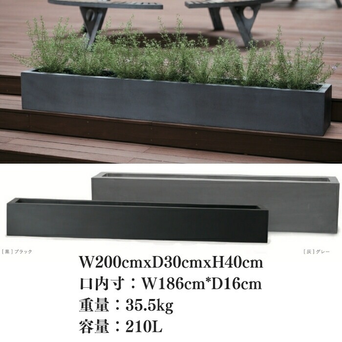 幅200cm・容量210Lの大型屋外用植木鉢。重厚感ある石調仕上げと高耐久ファイバーポリストーン製で、空間に上質な風格を演出します。