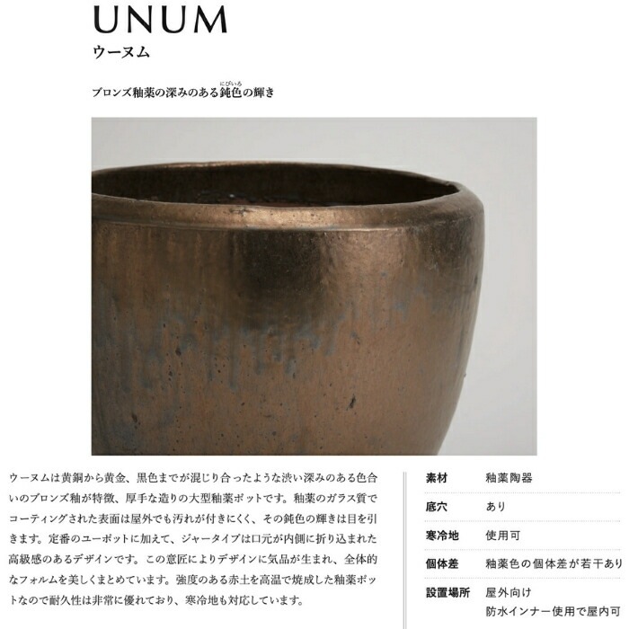 ウーヌム ジャー トール 17号は、ブロンズ釉薬の深みと陶器の重厚さが融合したラグジュアリープランター。