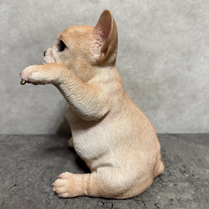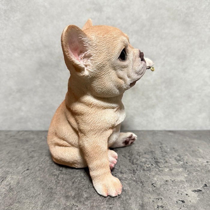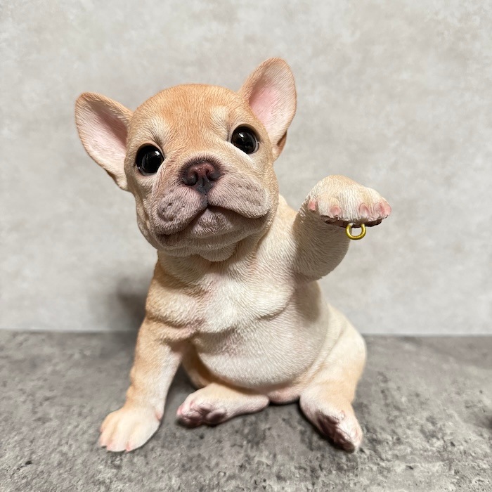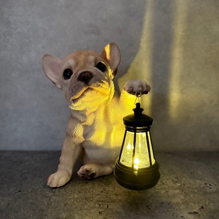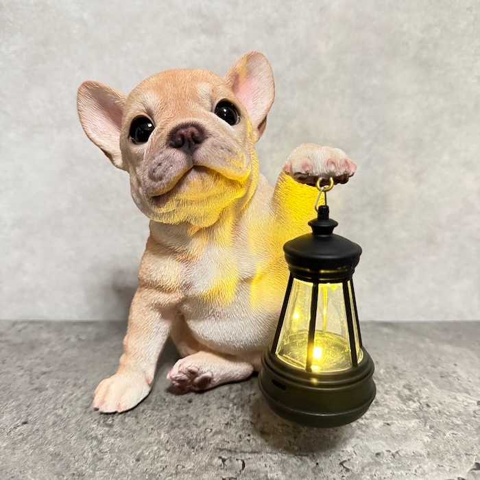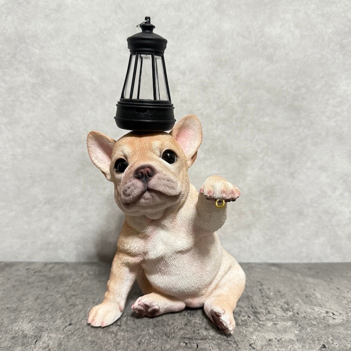 ソーラーランプを 左手で持ち上げる フレンチブルドッグのオブジェ(置物)