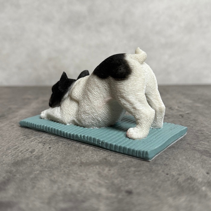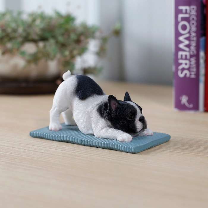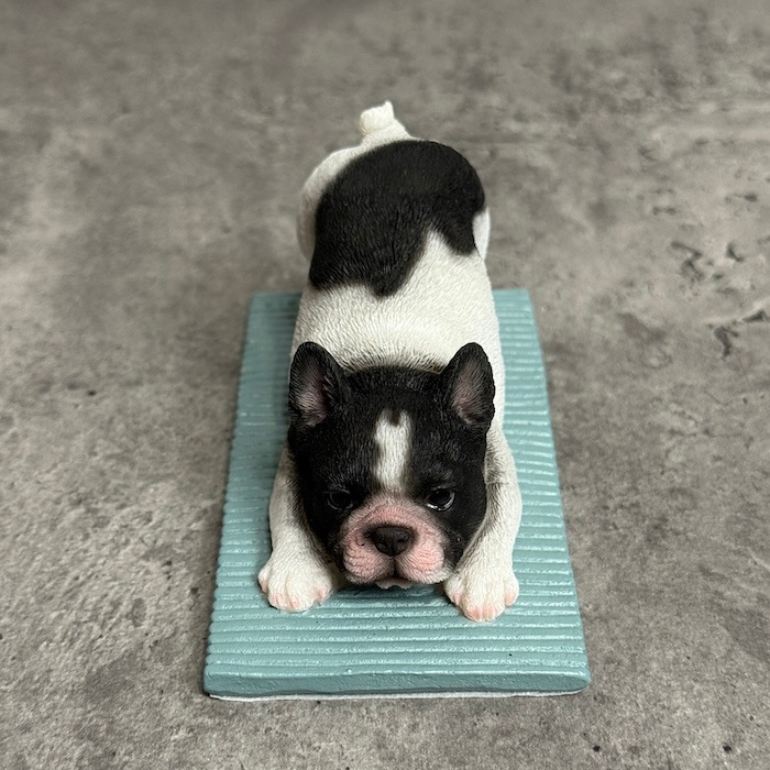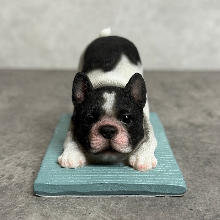フレンチブルドッグ特有の愛嬌ある表情と、思わず真似したくなる伸びポーズが魅力。
