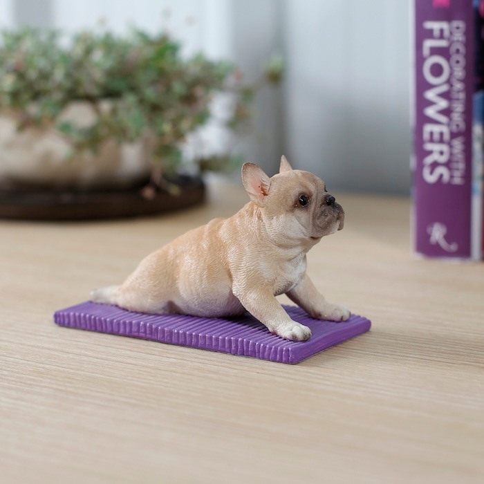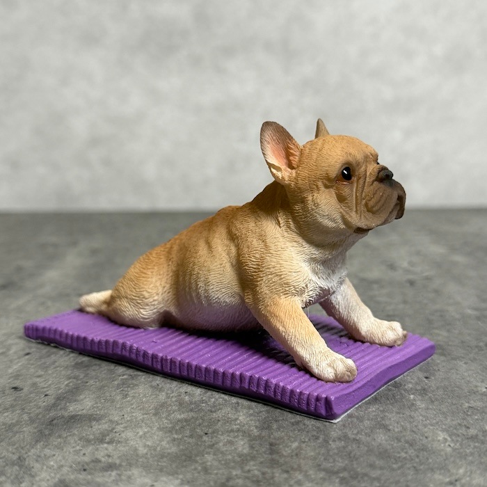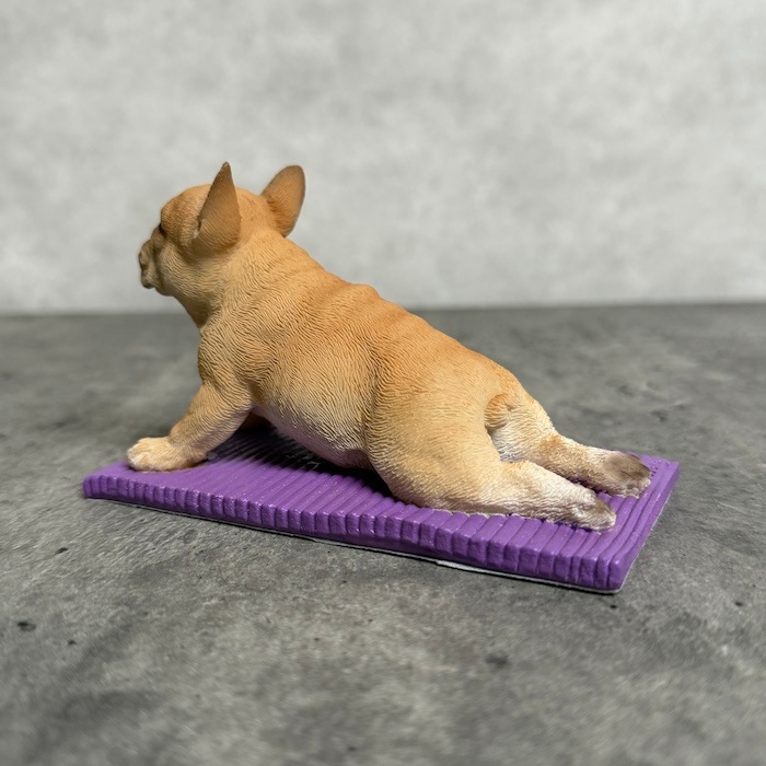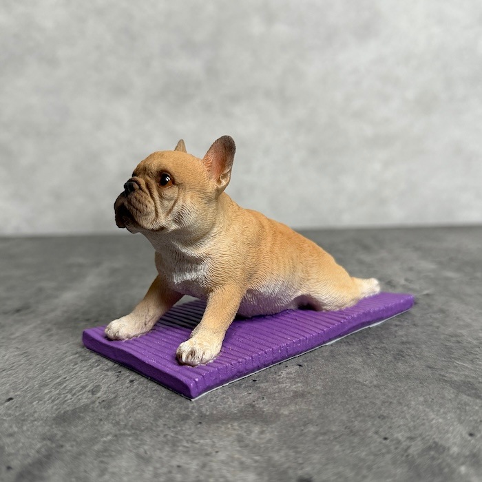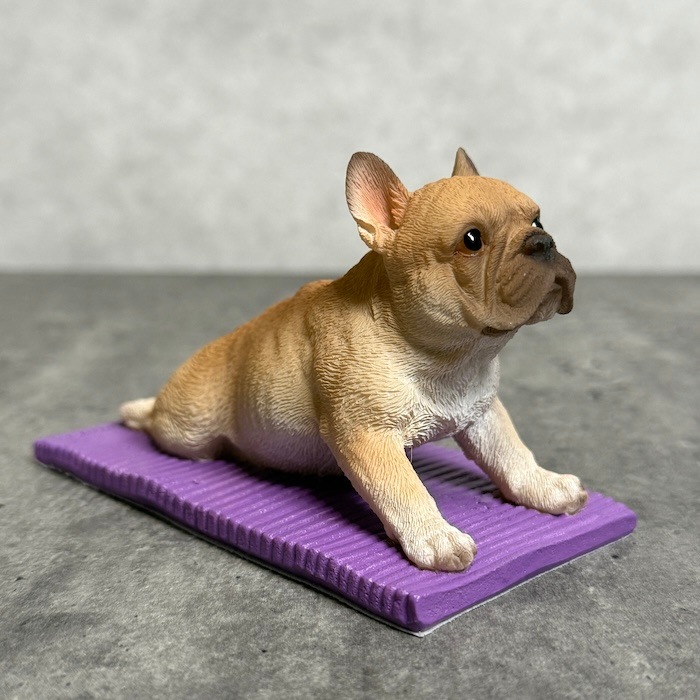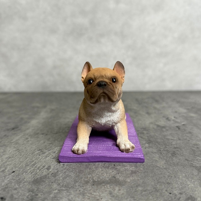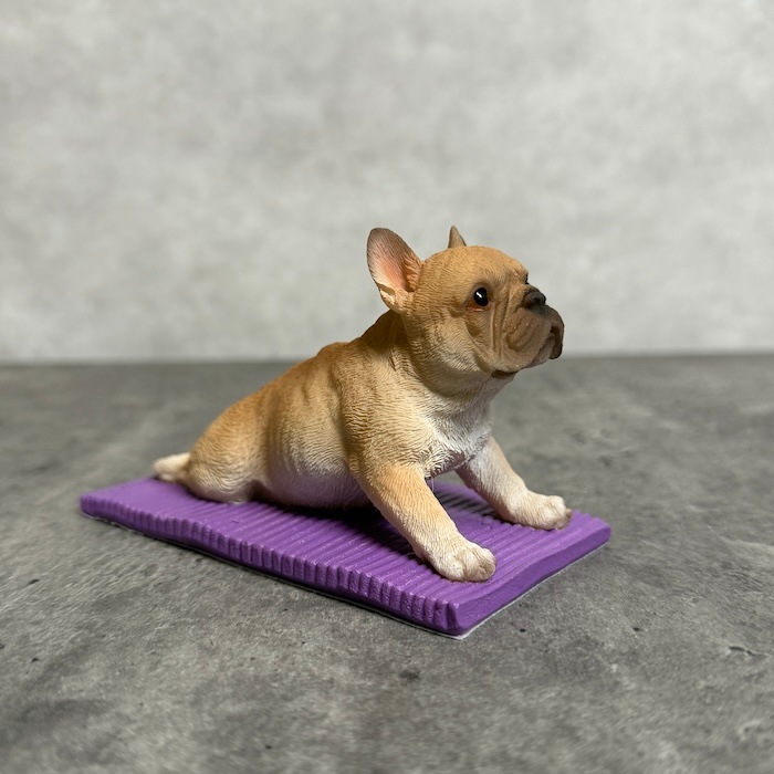 フレンチブルドッグ特有の愛嬌ある表情と、思わず応援したくなるポーズが魅力。